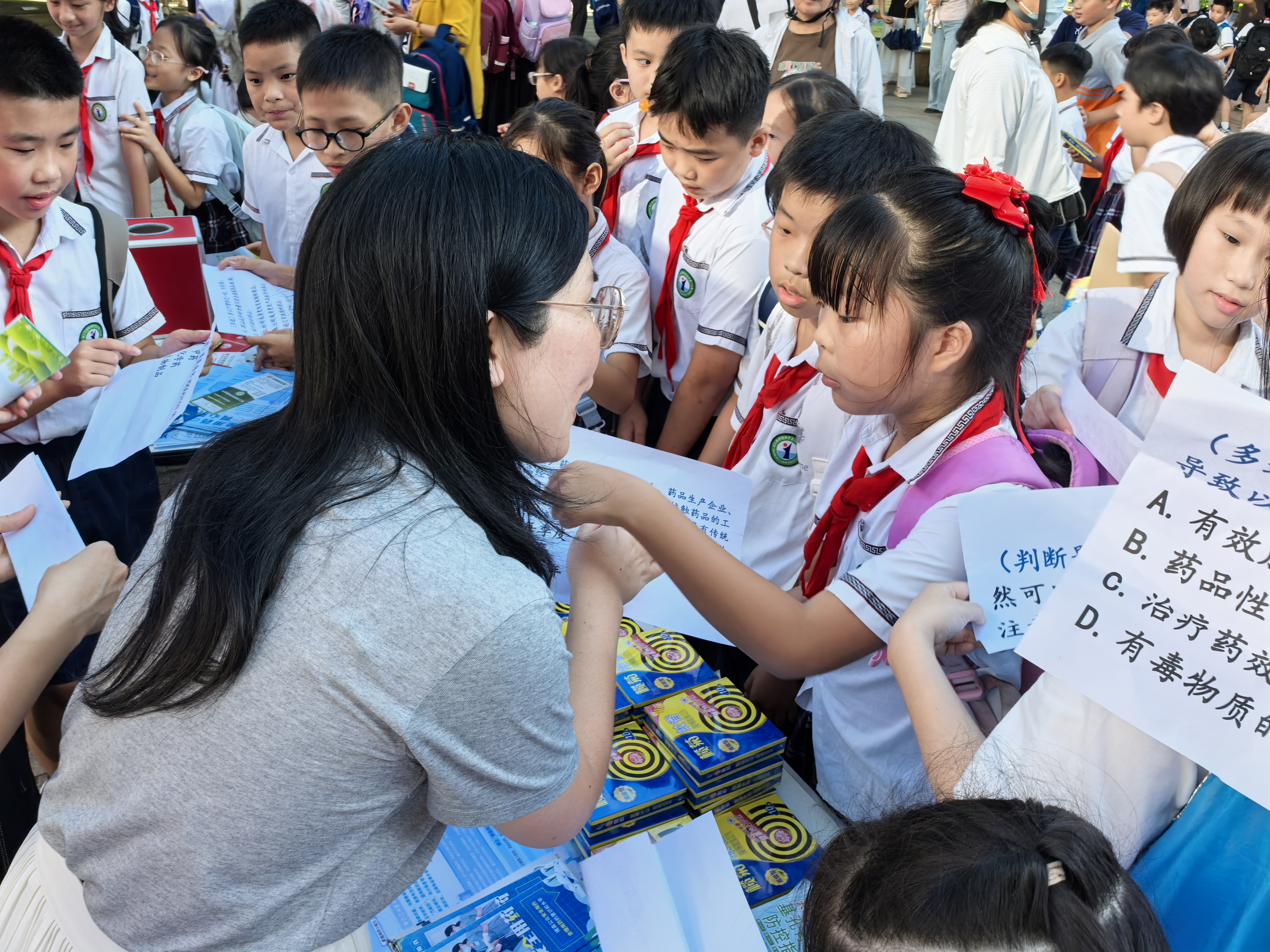 9月1日,在湛江市經(jīng)開區(qū)第一小學(xué)門前,湛江公司攜手泉莊街道人民社區(qū)黨委開展藥品安全進社區(qū)及及基孔肯雅熱防疫志愿活動?;顒蝇F(xiàn)場設(shè)置了“咨詢服務(wù)”、“有獎問答”環(huán)節(jié),正值開學(xué)第一天,活動現(xiàn)場許多家長和孩子一同積極參與到答題活動中,以此契機為同學(xué)們上了關(guān)于用藥安全科普的“開學(xué)第一課”。