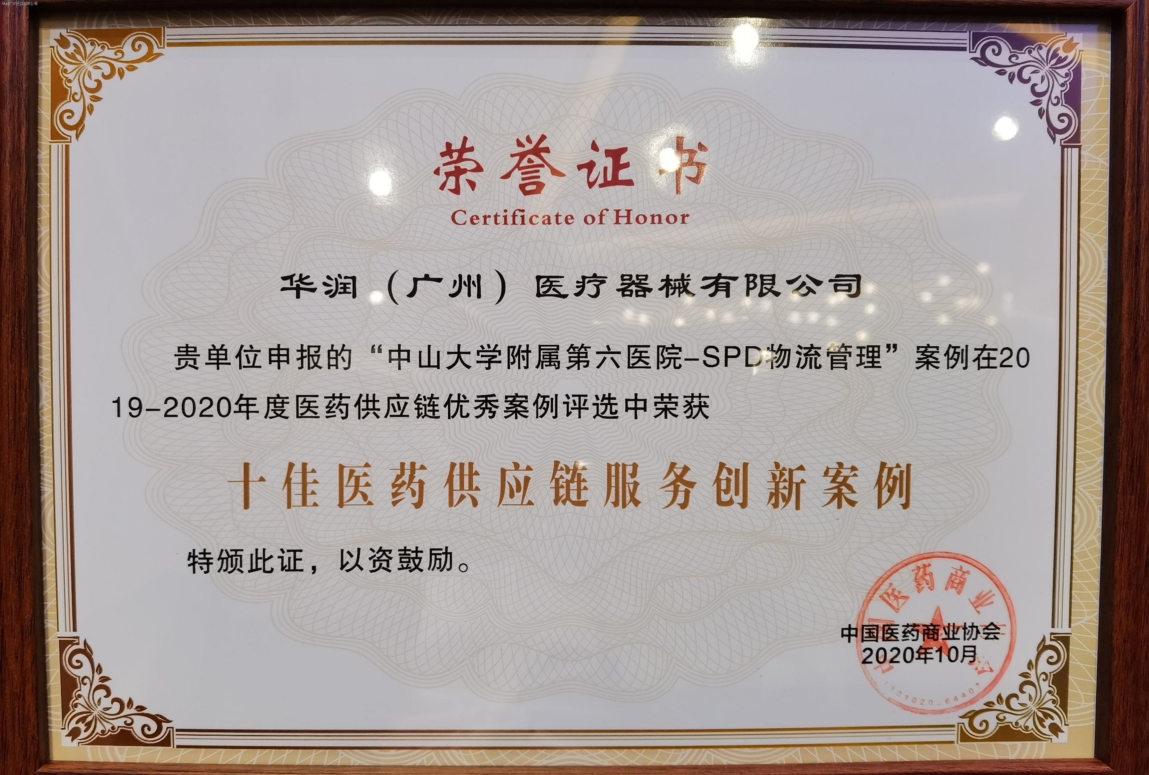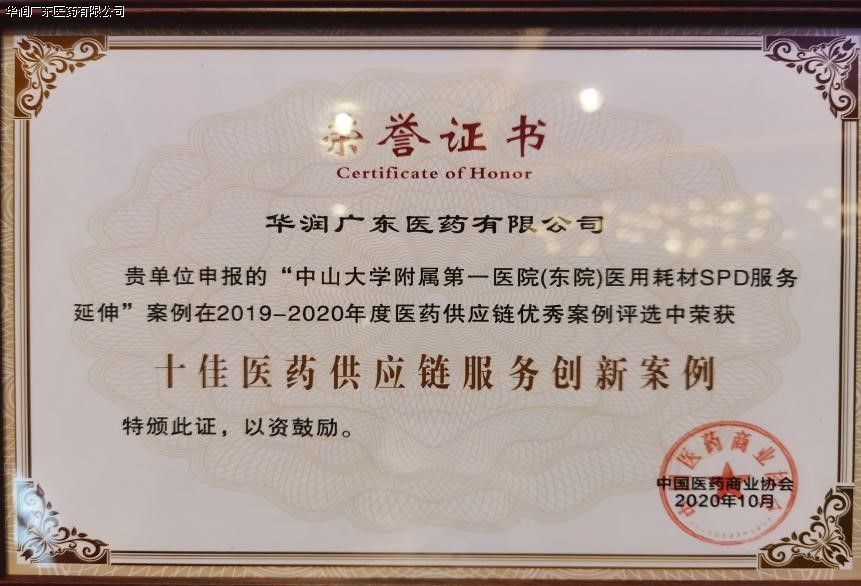 2020年10月30日,在廣州中心皇冠假日酒店舉行了2020年第五屆中國(guó)醫(yī)藥供應(yīng)鏈大會(huì)。華潤(rùn)廣東醫(yī)藥有限公司、華潤(rùn)(廣州)醫(yī)療器械有限公司申報(bào)“醫(yī)藥耗材SPD服務(wù)延伸”案例,在2019年-2020年度醫(yī)藥供應(yīng)鏈優(yōu)秀案例評(píng)選中,榮獲中國(guó)醫(yī)藥商業(yè)協(xié)會(huì)頒發(fā)的《十佳醫(yī)藥供應(yīng)鏈服務(wù)創(chuàng)新案例》獎(jiǎng)項(xiàng)。